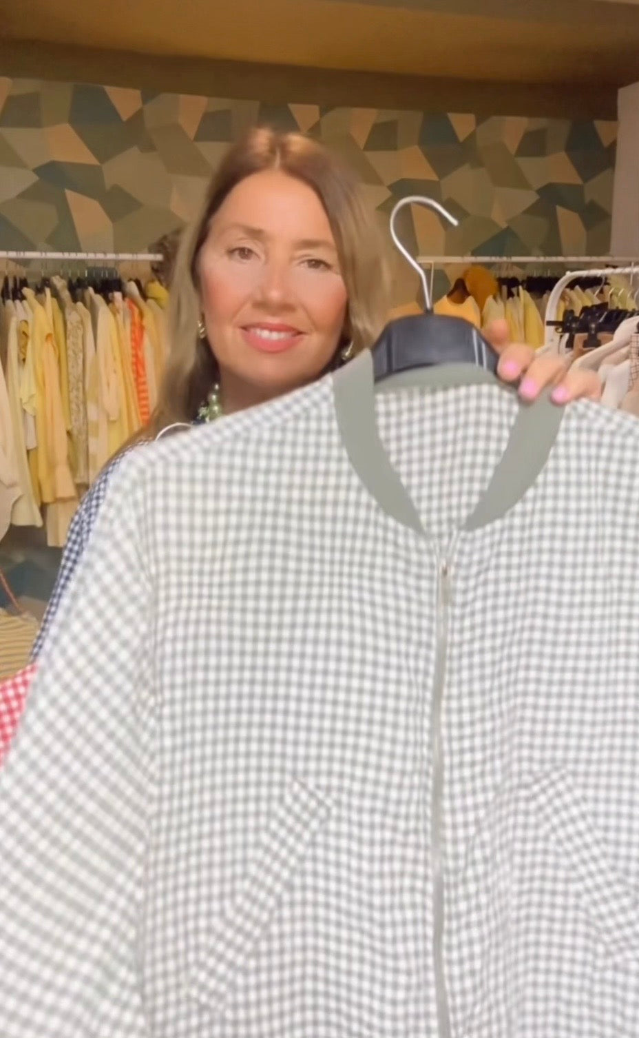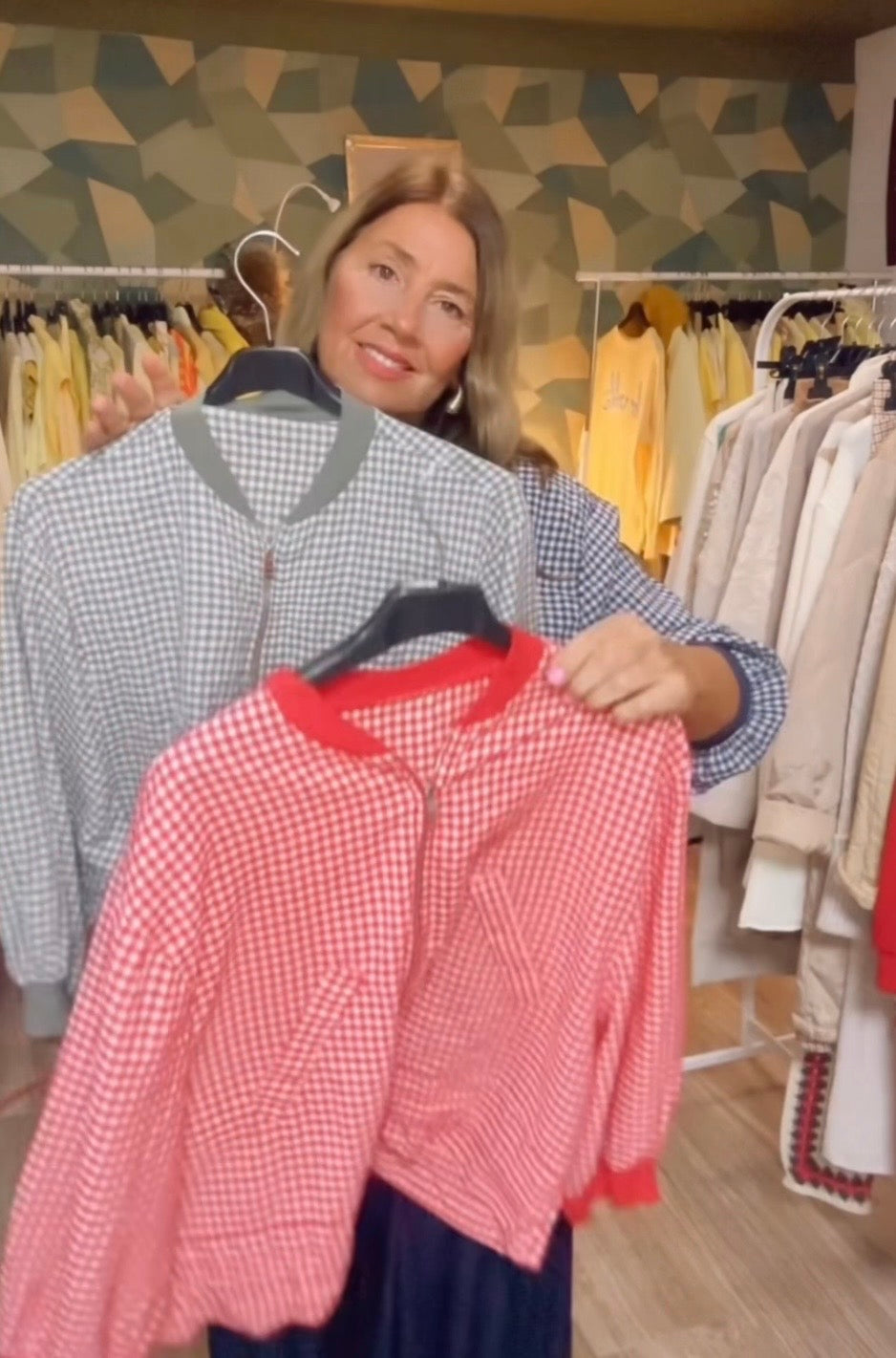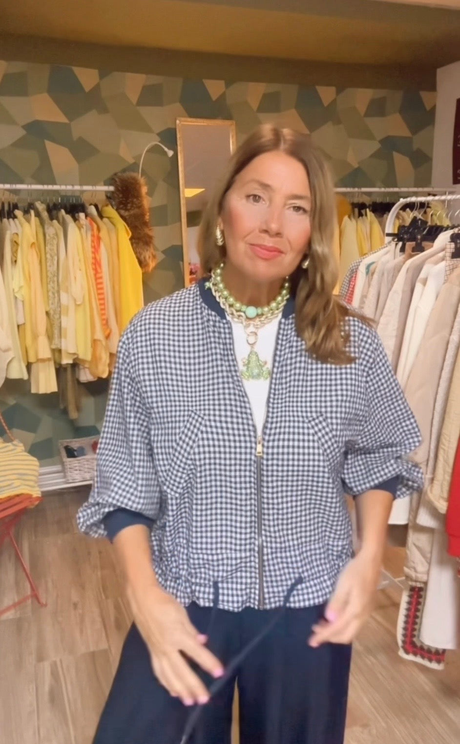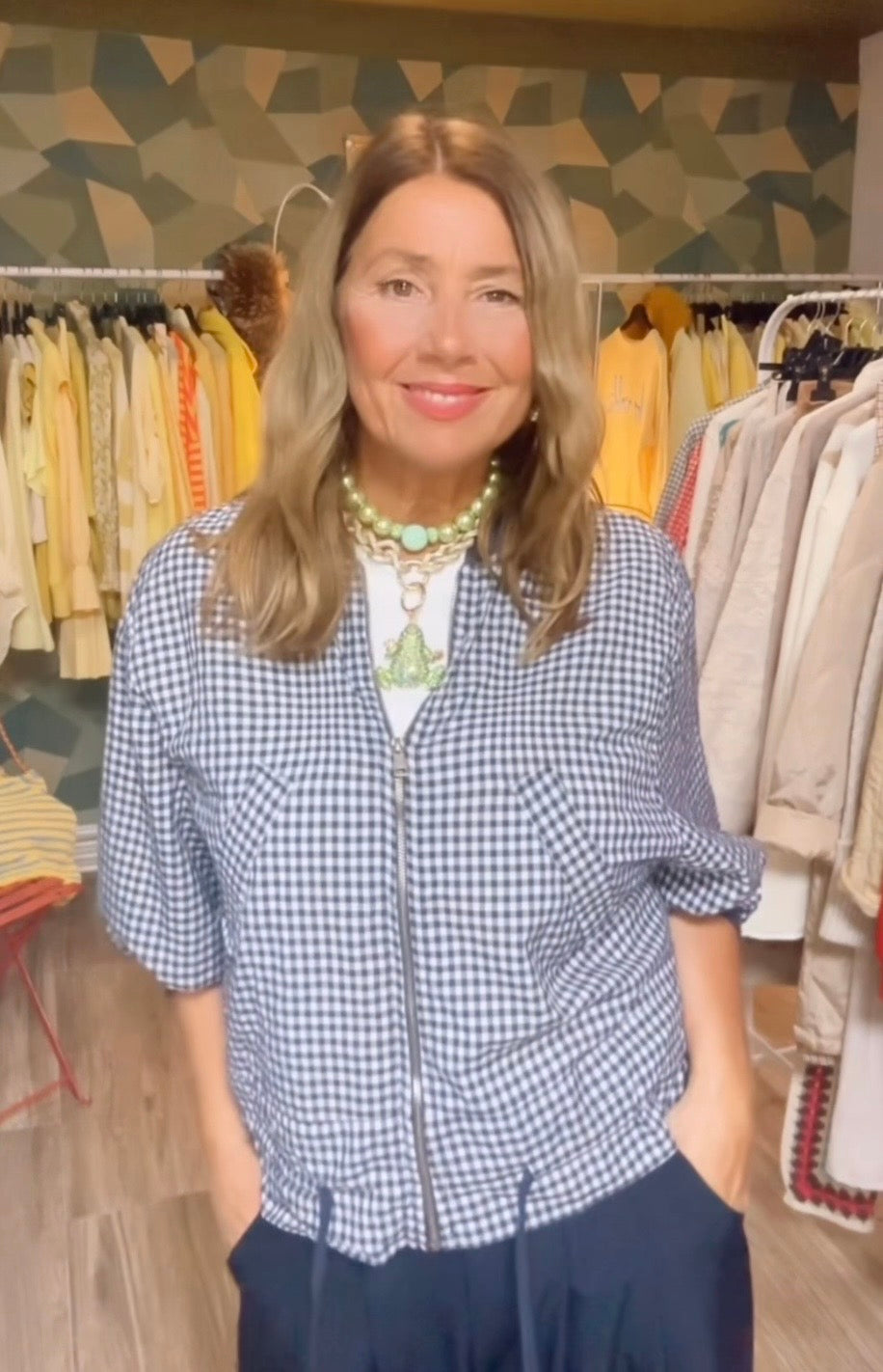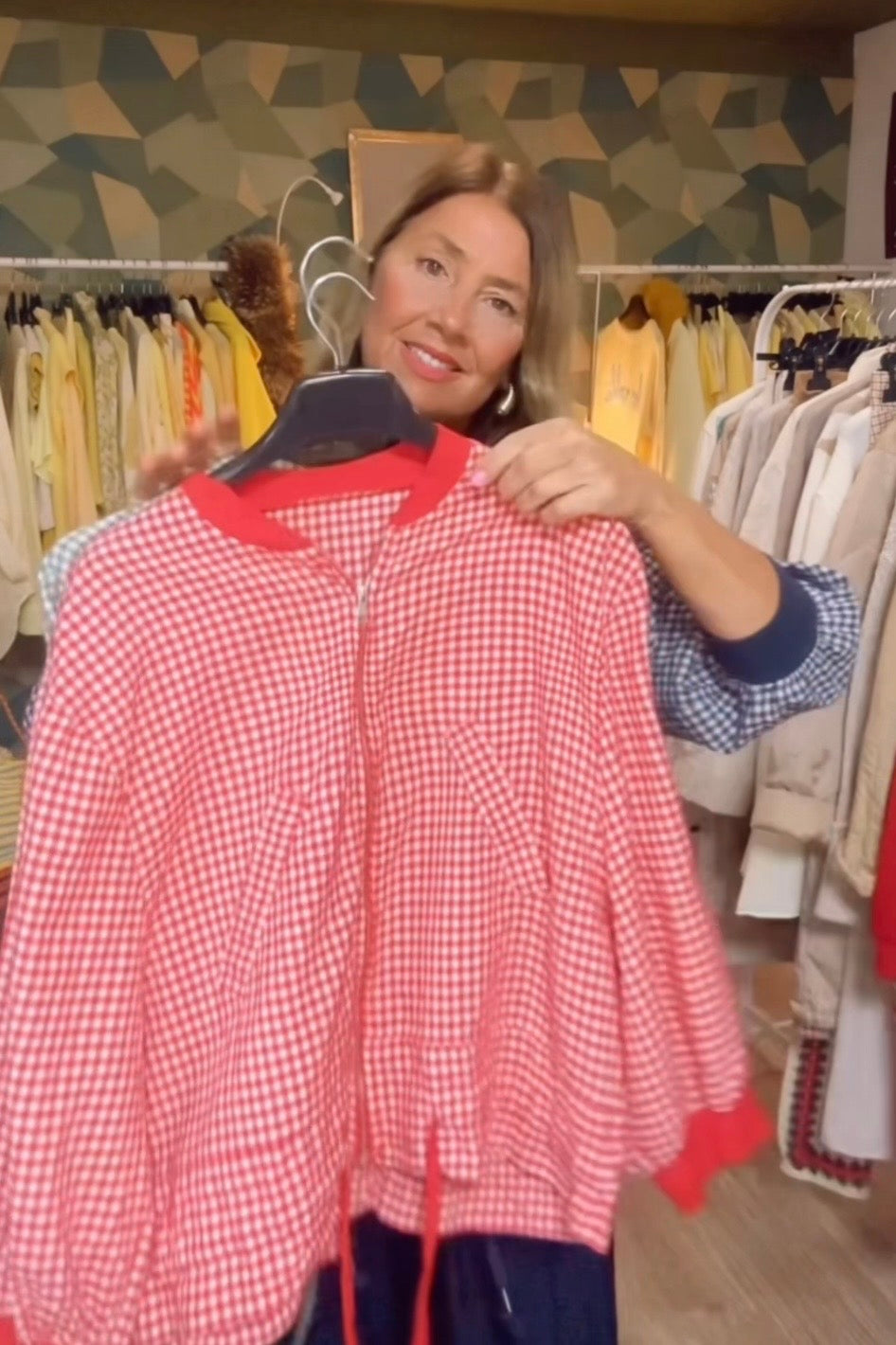 Cazadora de estampado vichi ,con cremallera ,ribete de punto