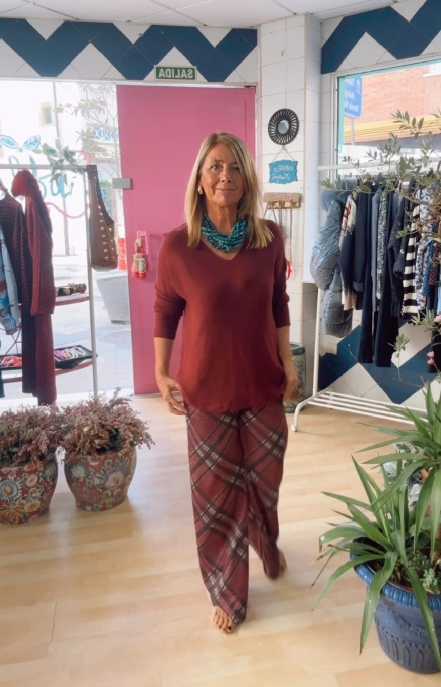 Pantalón palazo cuadros ,tejido de punto con cintura elástica ,recto de pierna